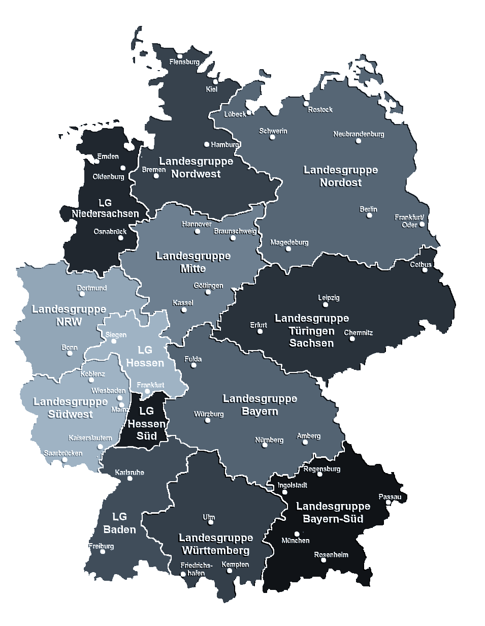 Landesgruppe Nordrhein WeltfalenLandesgruppe NiedersachsenLandesgruppe NordwestLandesgruppe NordostLandesgruppe MitteLandesgruppe HessenLandesgruppe SüdwestLandesgruppe Hessen SüdLandesgruppe WürtenbergLandesgruppe BadenLandesgruppe Türingen SachsenLandesgruppe BayernLandesgruppe Bayern Süd